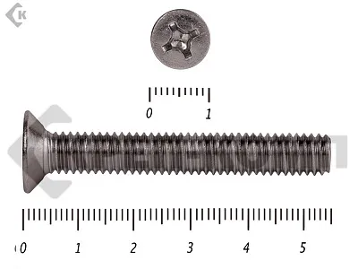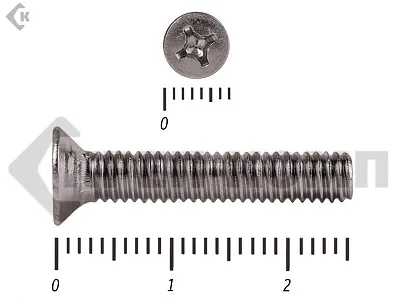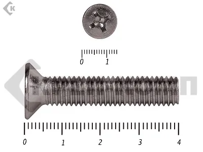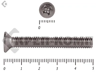 Винт DIN 965 из нержавейки с потайной головкой с крестообразным шлицем и полной резьбой. Данные винты выполнены из нержавеющей стали, благодаря чему, могут использоваться и в агрессивных средах, с повышенной влажностью. Винты нержавеющие DIN 965 используются в строительстве, машиностроении, промышленных и производственных отраслях совместно с шайбами, гайками соответствующих размеров.